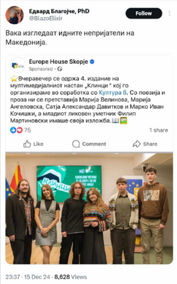 Имено, во изминатите два дена, група луѓе скриени зад своите Твитер-профили недолично и со говор на омраза го коментираат последното издание на мултимедијалниот настан „Клинци“ што се одржа на 17. октомври 2024 во просториите на Europe House – Скопје. Во рамки на мултимедијалниот настан младите поети и поетеси Марија Ангеловска, Марија Велинова, Сатја Александар Давитков и Марко Иван Кочишки се претставија со своја авторска поезија и проза, младиот уметник Филип Мартиновски се претстави со своја ликовна изложба, а модератор на настанот беше младиот поет Андреј Медиќ Лазаревски.