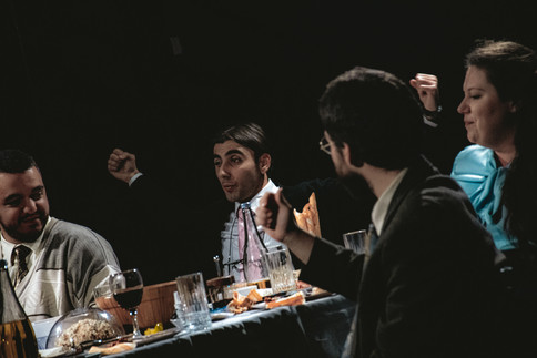 А ваквата анализа каде би се случувала на друго место ако не на софра заедно со комшиите. Сите седнати на маса, поставена централно во просторот, со публиката околу, заплетот започнува токму во дискусијата за руската салата – дали има мајонез или е туршија. Со сеприсутен хумор, боцкави теми кои можат да предизвикаат непријатност и кај „едната“ и кај „другата“ страна и со коментари кон сè што се случува во македонското општество – „Скопјани“ успешно го портретира истото и придонесува кон укинување на вечниот раздор: староседелци – новодојденци.